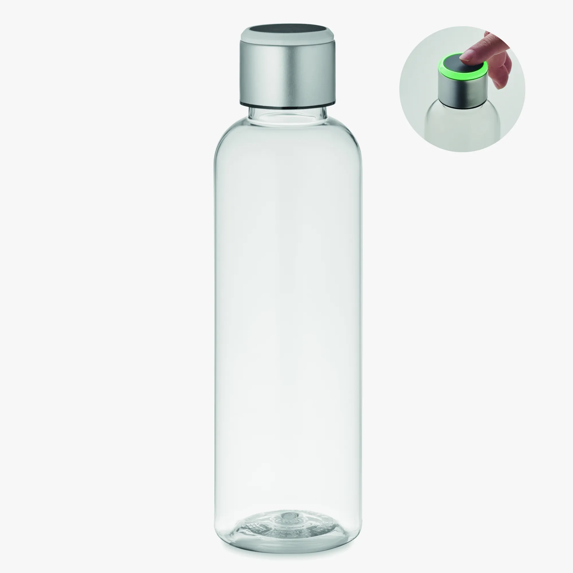 A garrafa em Tritan e aço com lembrete de hidratação combina corpo transparente em Tritan™ e detalhes em aço, incluindo um sensor luminoso que se acende a cada hora. Funciona com pilha CR2032 e convida a beber com regularidade ao longo do dia.