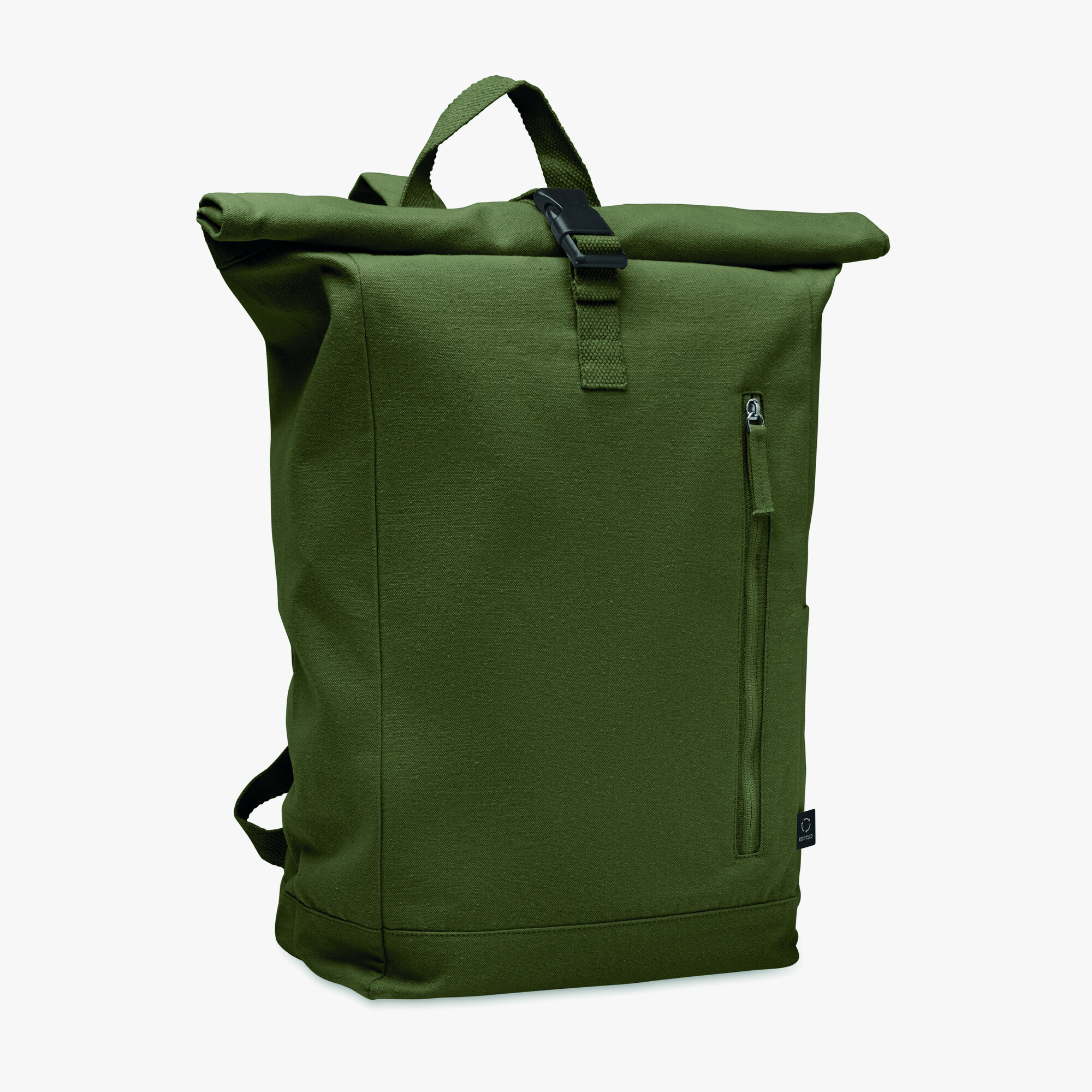 Esta mochila roll top de 390 g/m² utiliza tecidos reciclados de algodão e poliéster. Conta com fecho ajustável em velcro e bolso frontal com fecho de correr.