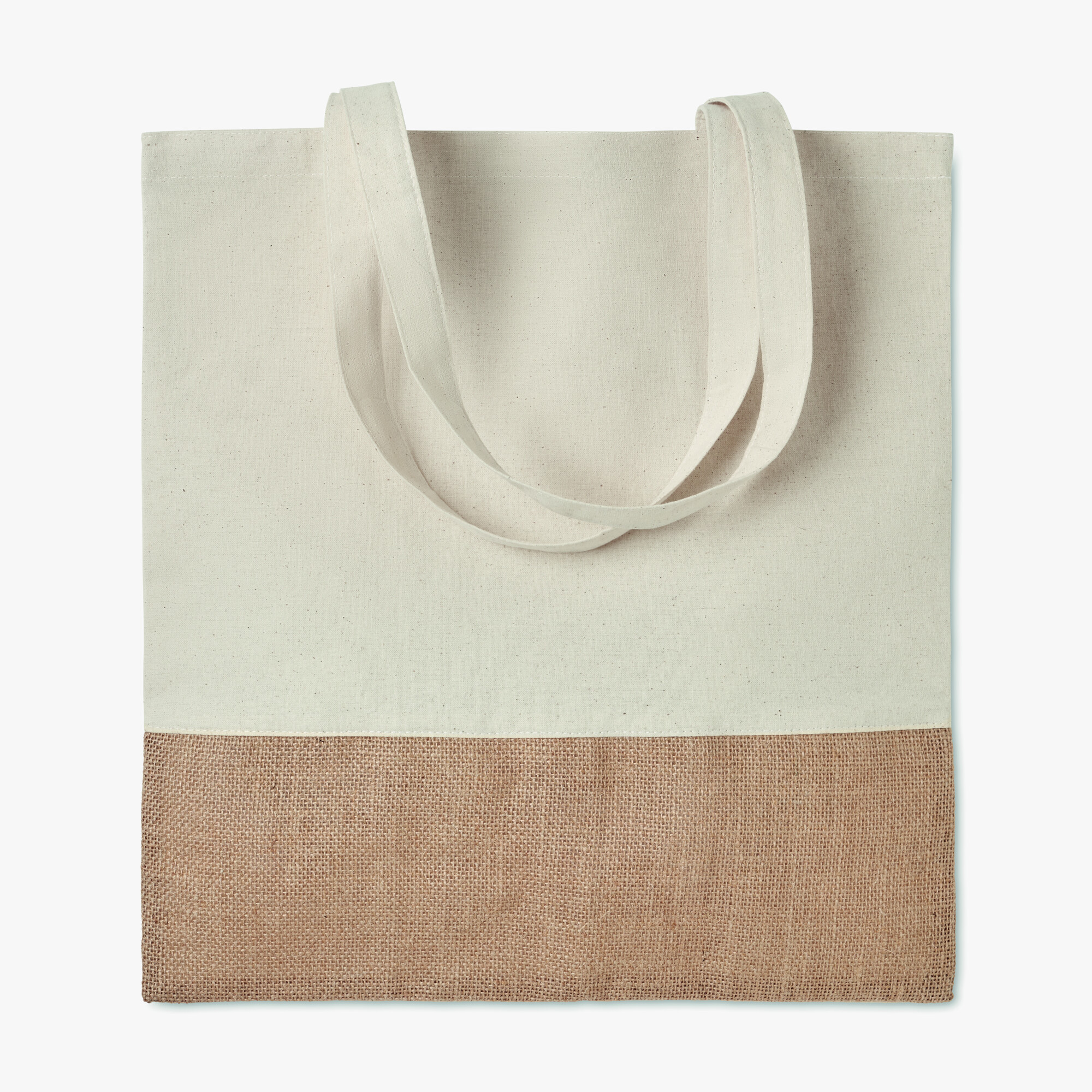 Confecionada em algodão twill de 160 gr/m², esta bolsa incorpora um atrativo detalhe em juta que acrescenta um toque distintivo. As alças compridas permitem levá-la confortavelmente ao ombro, tornando-a um suporte ideal para merchandising e brindes corporativos.