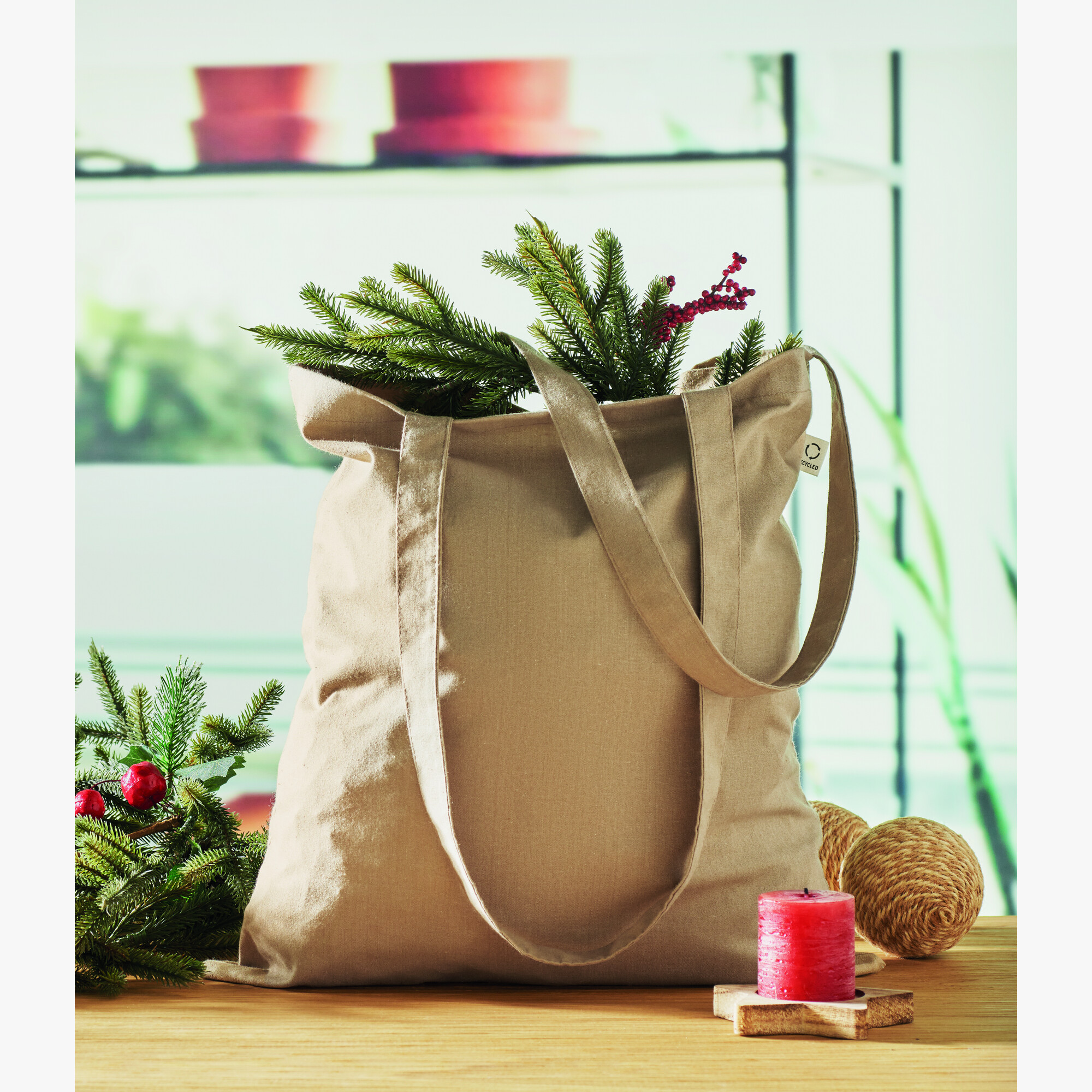 Fabricada em algodão reciclado pré-consumo (70 % algodão reciclado e 30 % RPET) de 140 gr/m², inclui alças compridas para um transporte confortável ao ombro. Este artigo pode encolher ligeiramente após a impressão, um detalhe técnico a considerar nos seus projetos de personalização.