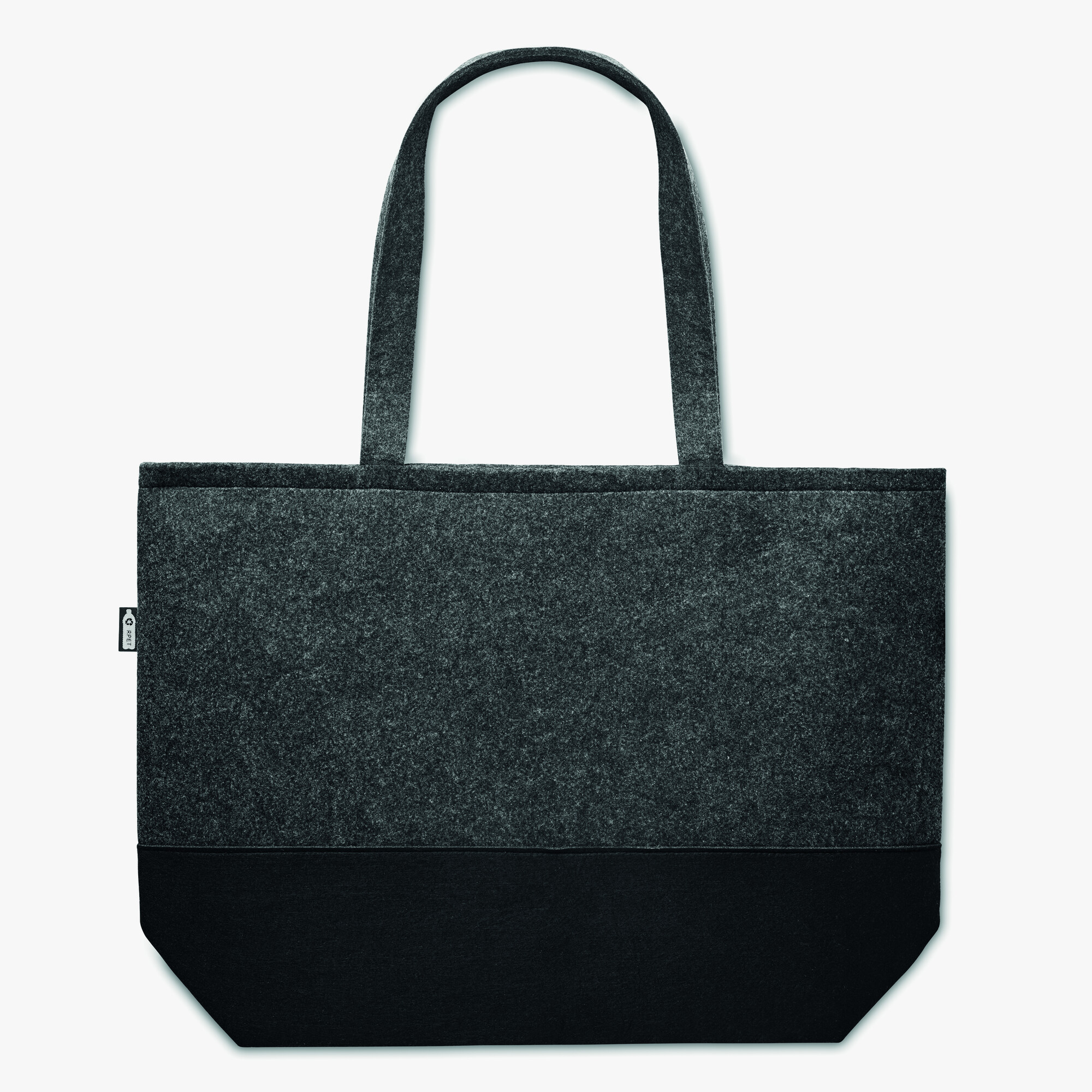 Fabricada em feltro RPET, esta bolsa incorpora alças compridas e uma base em contraste que acrescenta um toque distintivo. O seu tamanho permite utilizá-la tanto para compras como para transportar documentos, catálogos ou packs de oferta em ações de merchandising.